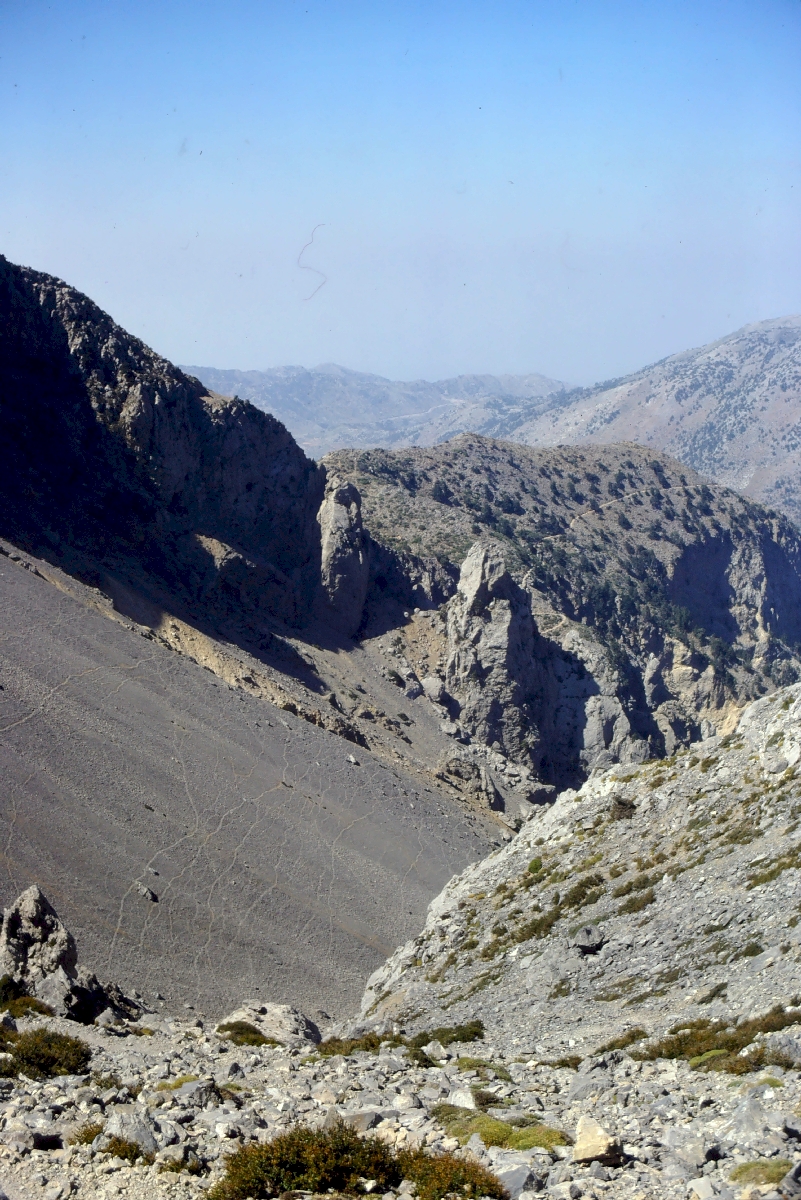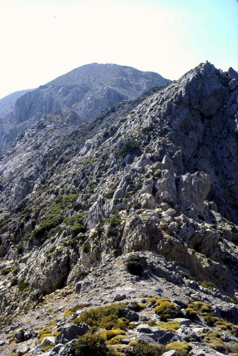 Du col de Xyloscalo par un sentier dans la pierraille, sans eau ni ombre. On peut consulter les sites décrivant l'ascension au sommet de Gingilos. | ||